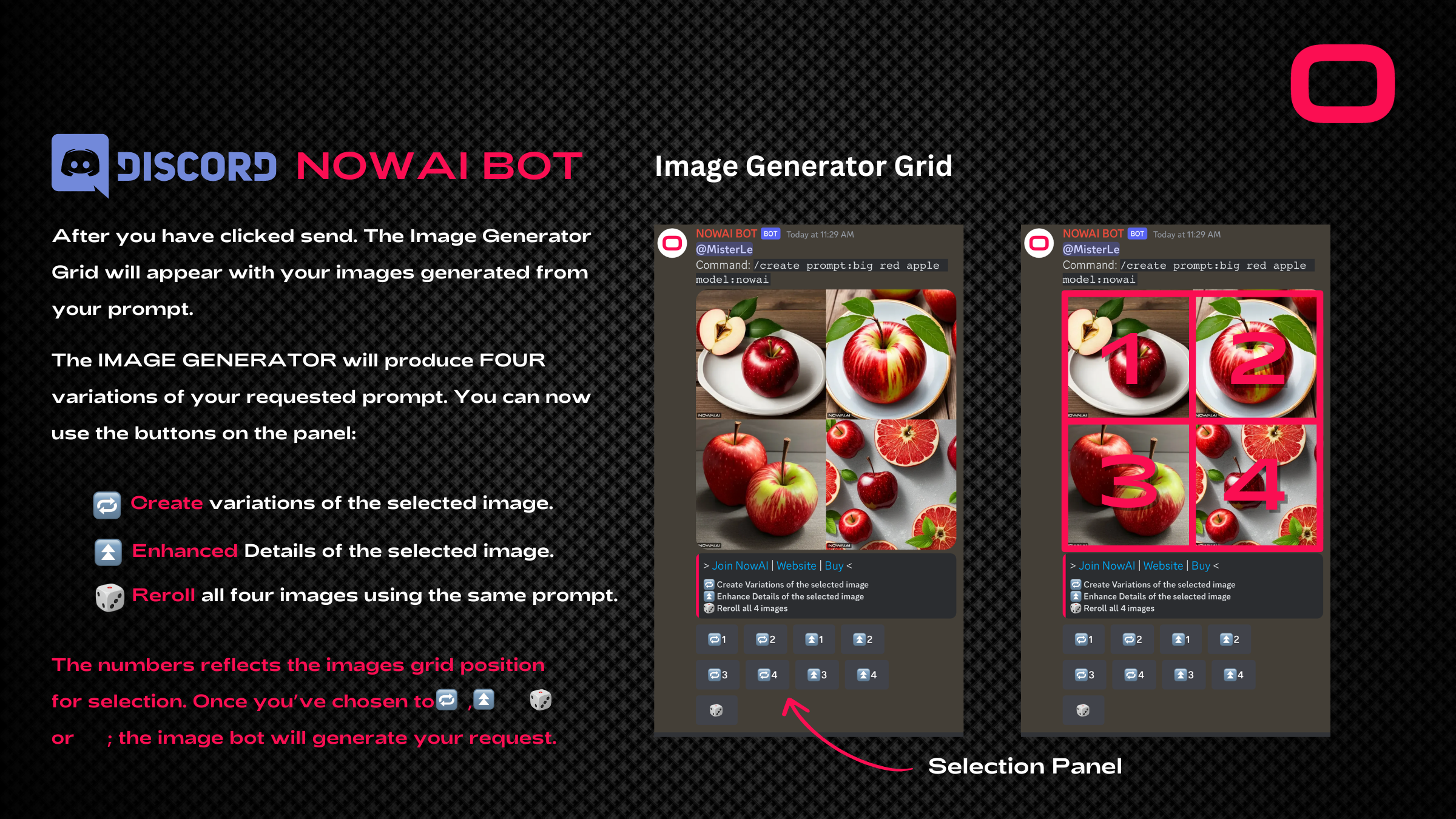 <figure><img src="https://content.gitbook.com/content/nsdvwnOzIBb65D90rMbG/blobs/ESzChYCJUYSztuiV5qyR/4.%20Discord%20GRID.PNG" alt=""><figcaption><p>NOWAI BOT Image generator GRID (click to zoom)</p></figcaption></figure>