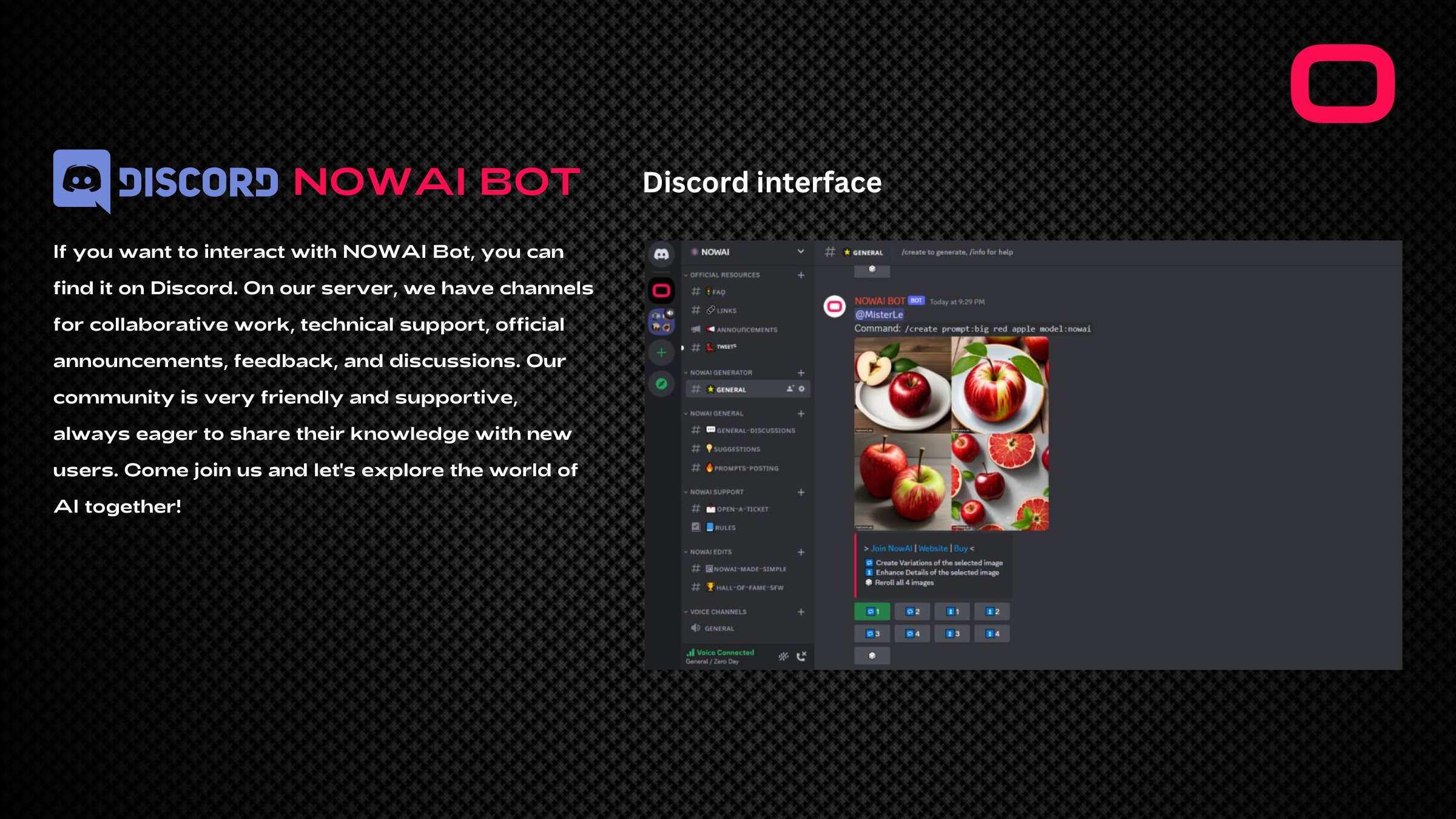 Connect with the NOWAI community on Discord to collaborate, get support, and share knowledge. Our channels cover technical support, billing, feedback, and more. Join us and interact with like-minded creators!