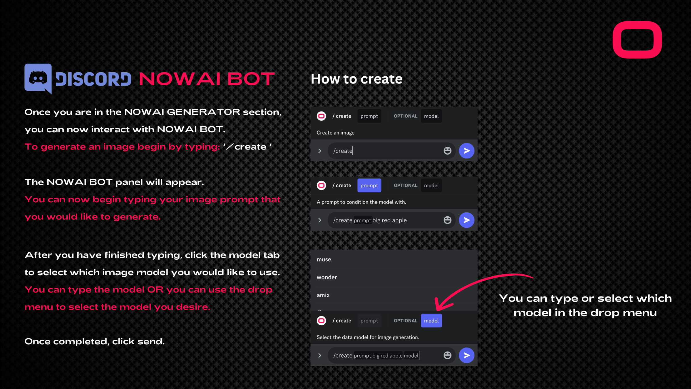 * When using /create, choose an available model from the model options. *Commands will remember your last selected model.* You can see what models are available on the '[Models section](https://nowai.gitbook.io/nowai/text-to-image/models)'&#x20;