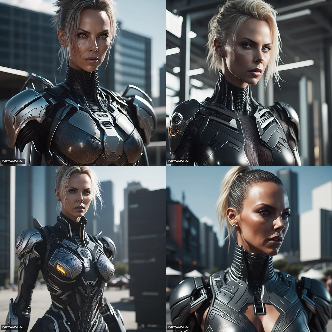 /sreal Cyborg Charlize Theron, hyper realistic, full body, super details, cyberpunk style, unreal engine, sunny day, soft focus lens